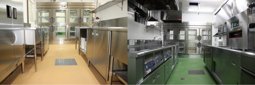 フロアの色で汚染区域と非汚染区域を明確に区別。厨房の使いやすさが食事のクオリティを左右します
